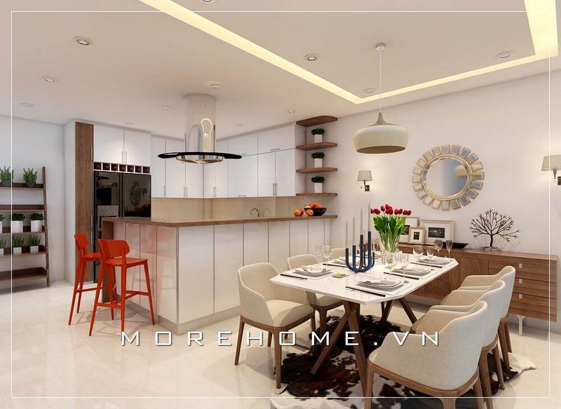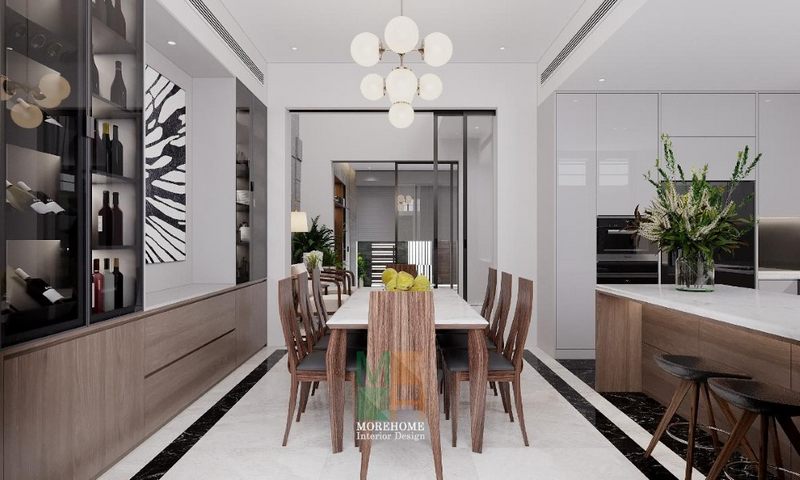 Mẫu bàn ăn gỗ được nơi bóng tạo sự phản chiếu ánh sáng cho phòng ăn, tạo hiệu ứng đẹp cho phòng ăn hiện đại