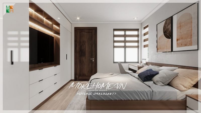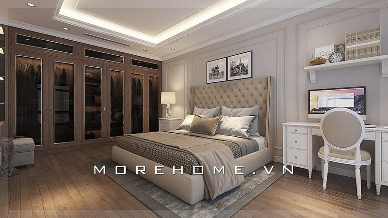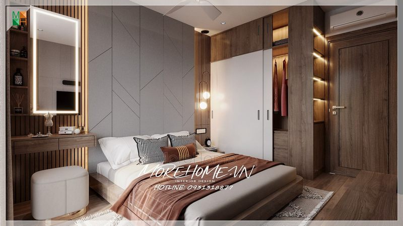 Thiết kế tủ quần áo gỗ kết hợp cánh kính hiện đại mang đến sự sang trọng cho không gian phòng ngủ Master chung cư cao cấp