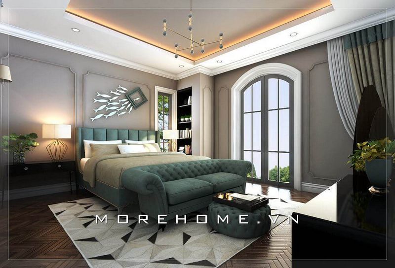 Mẫu giường ngủ bọc nỉ xanh tạo điểm nhấn cuốn hút cho cả không gian nghỉ ngơi của gia chủ