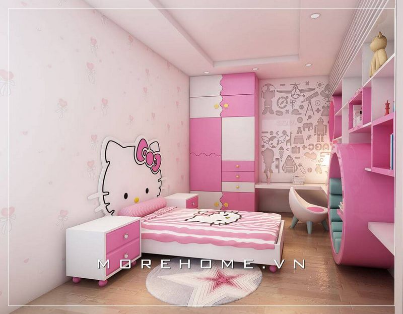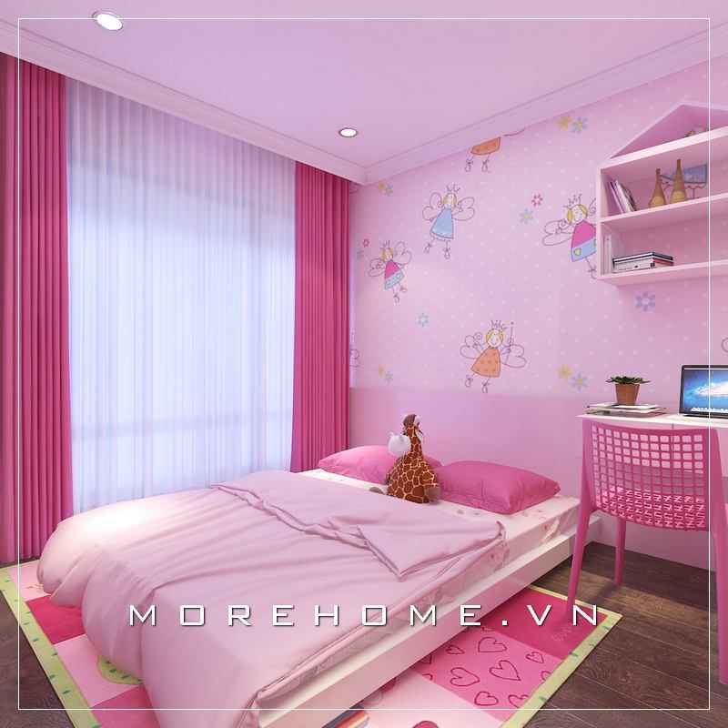 Nội thất phòng ngủ bé gái hiện đại, gam màu trắng chủ đạo kết hợp màu hồng nhẹ nhàng tạo nên không gian đầy nữ tính và đẹp mắt hơn