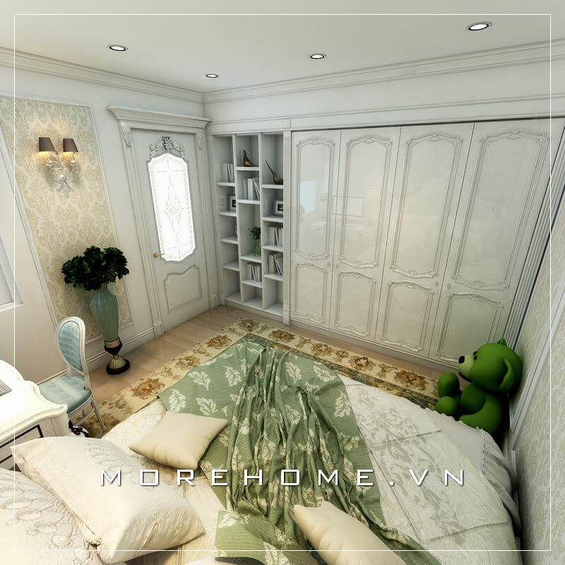 Giường ngủ bọc da màu trắng sữa kết hợp phần chân thấp tạo cảm giác thoải mái và thoáng hơn cho phòng ngủ con tại biệt thự cao cấp