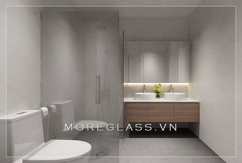 Sử dụng kính cường lực trong suốt làm vách ngăn giữa nhà tắm và nhà vệ sinh tạo cảm giác rộng rãi và thông thoáng hơn.