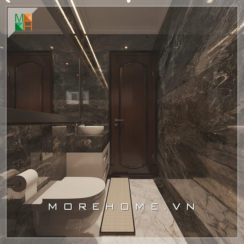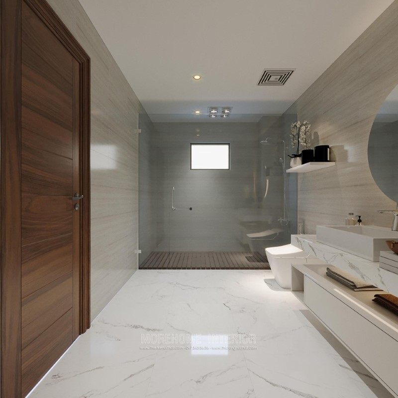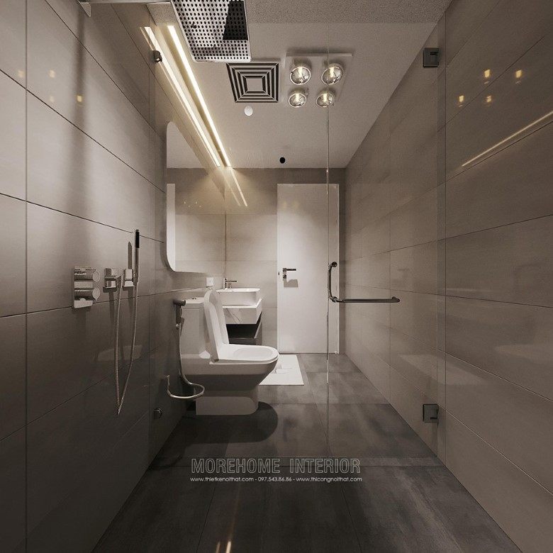 Gương phòng tắm to hình chữ nhật kéo dài giúp không gian phòng vệ sinh cảm giác rộng hơn và cao cấp hơn.