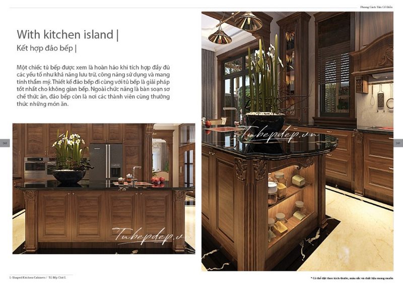 Thiết kế phòng bếp biệt thự, nhà phố gỗ óc chó độc đáo với bàn đảo mặt đá tự nhiên tinh tế
