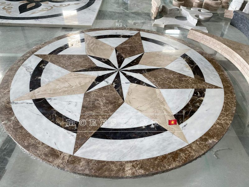 Mẫu đá lát sàn trang trí nơi sảnh chờ, phòng khách rộng,.... thiết kế hình tròn với những kết hợp họa tiết phối 3D độc đáo, sẽ là điểm nhấn ấn tượng nếu được sử dụng ở bất kì đâu.