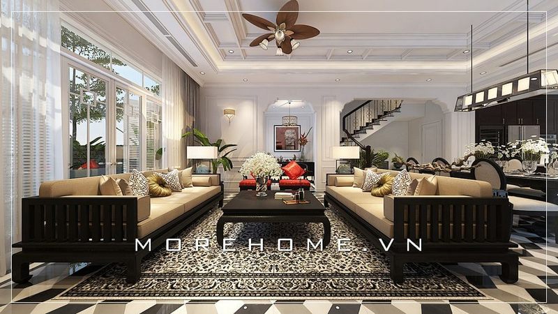Thiết kế phòng khách chung cư, nhà phố, biệt thự theo phong cách Indochine với nội thất sơn đen nổi bật