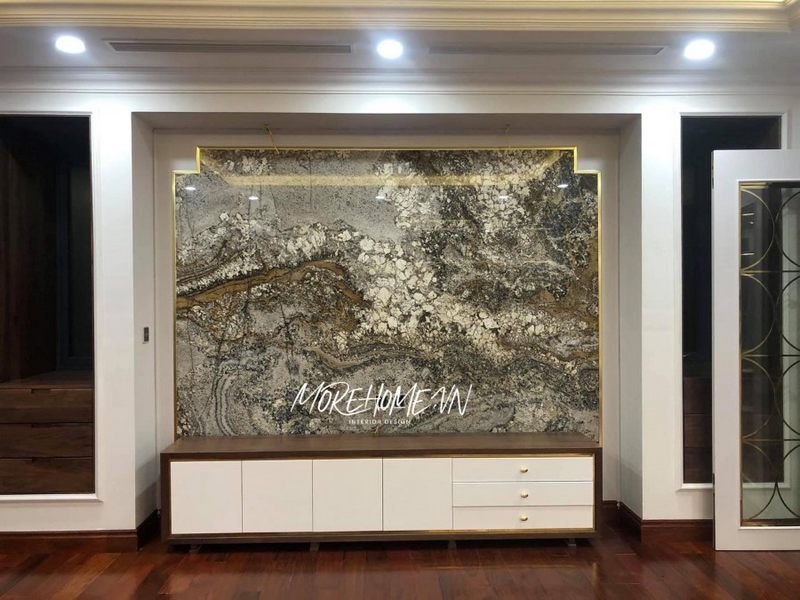 Vách Tivi phòng khách sử dụng đá nhân tạo vân mây sang trọng