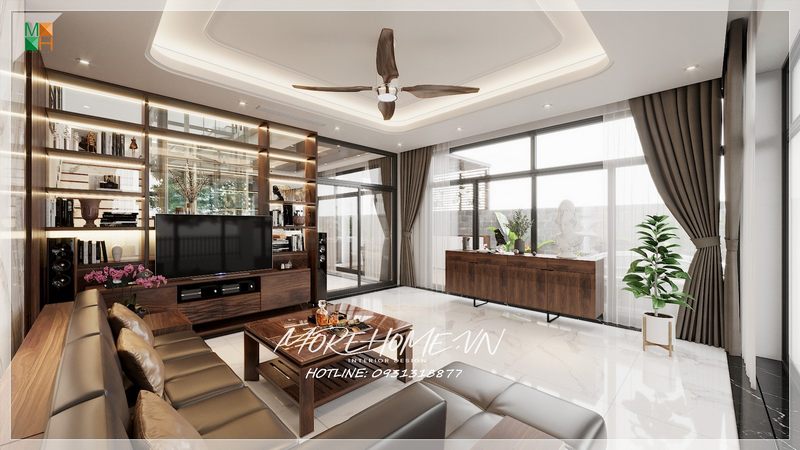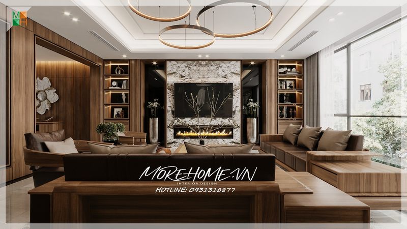 Phòng khách với thiết kế nội thất gỗ óc chó sang trọng hiện đại và thẩm mỹ cao mang lại vẻ đẹp sang trọng cho nhà phố, biệt thự